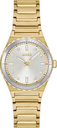 A silver sunray dial brightens this minimalist bracelet watch marked with sparkling crystal indices for a dose of glam.