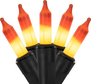 Light up your Halloween with this 50-count yellow and orange candy corn mini Halloween light set on black wire. Designed to mimic the classic candy corn color palette, these mini lights alternate between warm yellow and vibrant orange bulbs, creating a nostalgic and fun seasonal glow. Whether you're decorating your porch, mantel, banister, or party space, this cheerful strand brings a playful Halloween charm to any setting. Each light is spaced evenly along a durable black wire that blends seamlessly into dark backgrounds for a floating illumination effect. With a total length ideal for both small accents and larger displays, this candy corn light set offers flexibility for indoor or covered outdoor use. The plug-in design allows for easy connectivity with additional strands, making it simple to extend your display across windows, fences, or walkways. Perfect for Halloween parties, trick-or-treat night, or autumn-themed decor, this mini candy corn light set adds seasonal warmth with a hint of sweet style. Durable bulbs and reliable construction ensure you can enjoy them year after year. Create a cozy, glowing backdrop that captures the spirit of fall and Halloween night with this fun and functional decorative light strand. Product features: Color: orange/yellow dipped bulbs / black wire Number of bulbs on string: 50 Bulb size: mini Bulb type: incandescent Spacing between each bulb: 2.5" Lighted length: 9.5' Total length: 11.5' 18" lead cord 4" tail cord Additional product features: If one bulb burns out the rest will stay lit UL certified and approved for indoor or outdoor use Comes with replacement bulbs and spare fuse Contains end-to-end connectors which allow you to connect multiple sets together (not to exceed 210 watts) Wire gauge: 22 120 volts, 60 hertz, .17 amps, 20.4 amps Material(s): glass bulbs/wire
