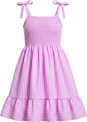 These charming matching outfits feature a playful pink and white stripe pattern, with a fitted smocked bodice and adjustable tie straps for a sweet and comfortable fit.