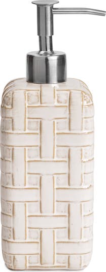 A rustic texture inspired by woven raffia palms makes this ceramic lotion dispenser a serene addition to your bathroom counter.