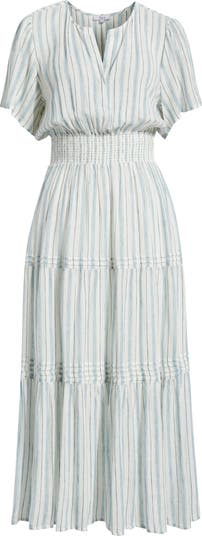 Stripes are always in season, but when they pattern a smock-waisted dress mostly made from lightweight linen, we suggest the sunny one.