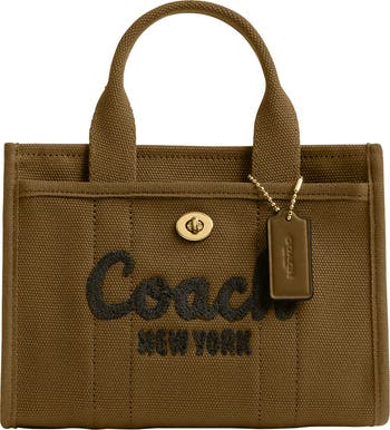 Durable canvas and a spacious interior distinguish a scaled-down tote fitted with easy top handles and a detachable webbing strap.