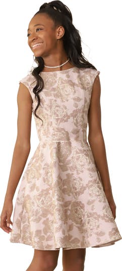 A splash of metallic fibers brings glamorous shine and light texture to a party-ready fit-and-flare dress that will keep your child shimmering under the lights.