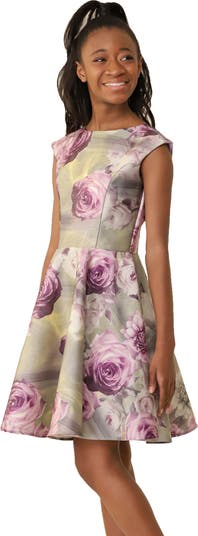 A splash of metallic fibers brings glamorous shine and light texture to a party-ready fit-and-flare dress that will keep your child shimmering under the lights.