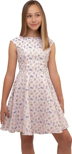 A splash of metallic fibers brings glamorous shine and light texture to a party-ready fit-and-flare dress that will keep your child shimmering under the lights.