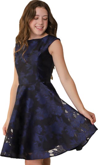 A splash of metallic fibers brings glamorous shine and light texture to a party-ready fit-and-flare dress that will keep your child shimmering under the lights.