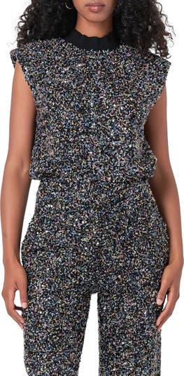 Rock a bold, textural look with this colorful bouclé-tweed top featuring cap sleeves and a solid mock neck for contrast.