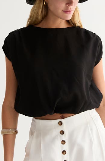 A cap-sleeve top designed with a clean boat neckline and subtle shirring at the shoulders. The softly structured bubble hem and semi-cropped length create a modern, sculpted silhouette, finished with a hidden back zipper for a smooth, refined fit.