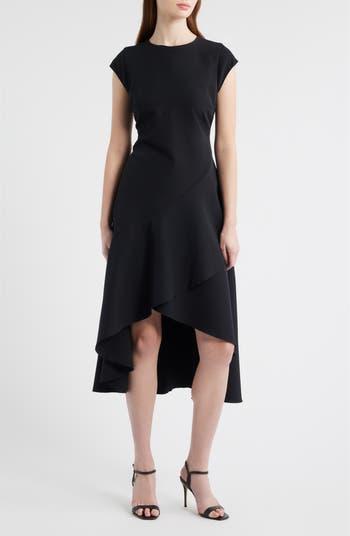 Stretch-kissed fabric and bias-cut seaming shape the sleek silhouette of this cap-sleeve dress finished with a modern high-low hem.