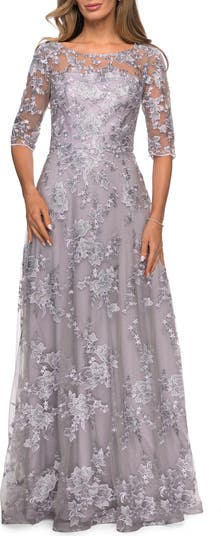 Gorgeous lace A line dress with sheer top and three-quarter sleeves. Back zipper closure.