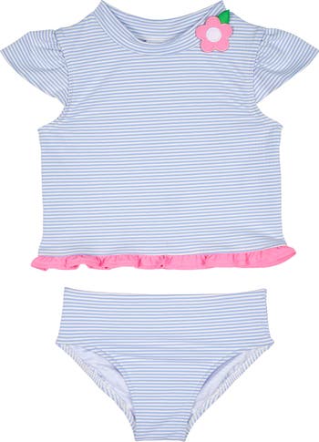 Designed for sunny days and splash-filled adventures, this cap-sleeve tankini is made from light blue and white stripe seersucker swim fabric with soft stretch for comfort and ease. A cheerful appliqué flower adds a bright, playful touch to the top, while UPF 50 protection helps shield delicate skin. Shirred back legs ensure the bottoms stay perfectly in place during swim and play, keeping her comfortable and confident all day long.