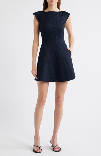 Perfect for your party circuit, this luxe sateen minidress is fashioned in a seamed fit-and-flare silhouette framed by a scooped back and hidden side pockets.