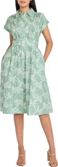 Tropical palms boost the resort-ready charm of this lightweight cotton-blend shirtdress framed by cuffed dolman sleeves and practical side pockets.