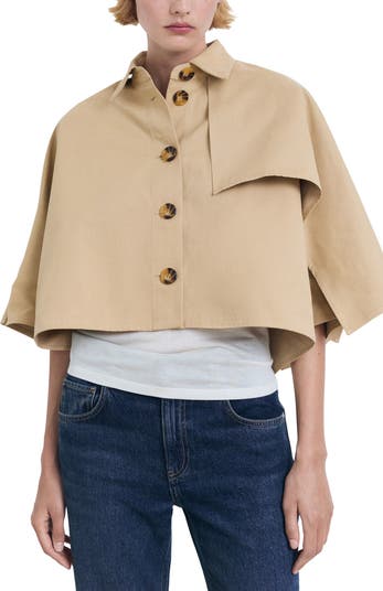 Trench coat style gets fun and flirty with a cape-style option cut from a cotton blend and rendered in the traditional neutral shade.