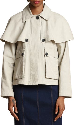 A flouncy cape detail sweetens a staple jacket cut from sturdy cotton and popped with plenty of pocket space.
