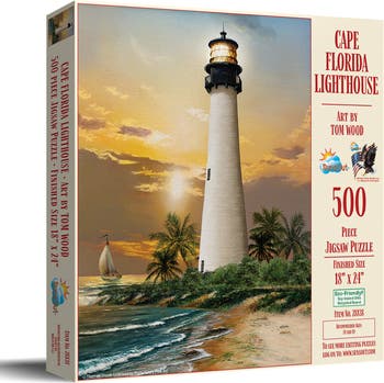 Immerse yourself in the serene coastal beauty of the Cape Florida Lighthouse with a captivating 500-piece jigsaw puzzle, masterfully crafted by SunsOut. Witness stunning detail and vibrant hues in Tom Wood's artwork as the picturesque scene of sun, sea, and sand comes to life piece by piece. High-quality craftsmanship and interlocking pieces made of premium recycled cardboard provide a satisfying assembly experience. Measuring 18" x 24" when complete, this puzzle offers both a rewarding challenge and an environmentally responsible escape into a coastal paradise. Committed to sustainability, SunsOut utilizes soy-based inks and high-quality recycled board, taking a conscientious step towards a greener planet with every puzzle piece. You can enjoy a worry-free puzzling journey, knowing all puzzles are proudly made in the USA and come with a guarantee against missing or damaged pieces from SunsOut, a brand renowned for its outstanding customer service. SunsOut also stands out as a proud woman-owned small business, emphasizing diversity and empowerment within their industry. Invite creativity and artistic wonder into your home with their Cape Florida Lighthouse puzzle. Each SunsOut puzzle, featuring fully licensed artwork by top artists, serves as both a deeply satisfying and artistically enriching tribute to human creativity in jigsaw form. By choosing SunsOut, you not only enjoy an exceptional puzzling experience but also support inclusivity and small business innovation.