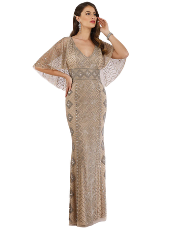 This cape sleeve gown features a v-neckline and geometric beading patterns. The stretchy material makes fitting easy for any size.