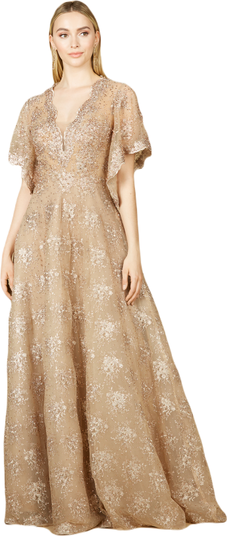 This is a glittering lace ballgown with cape sleeves with a v-neckline featuring a gorgeous embroidered pattern. It is a humble style, with detailing that makes it stand out like the delicate cape sleeves and starburst patterns