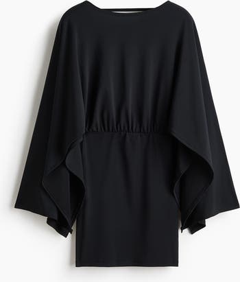 Short dress in a fine knit with a boat neckline and an open back with a horizontal strap at the top. Long, voluminous cape sleeves and a gathered seam at the waist.