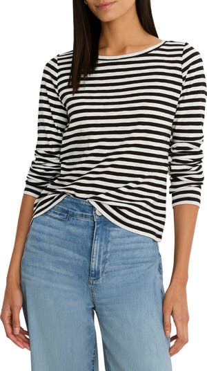 Long sleeves and a boat neck provide polished finishing touches for this softly ribbed T-shirt patterned in crisp stripes.