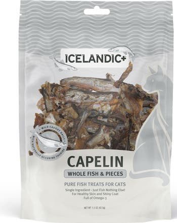 For healthy skin and shiny coat. Your cat will love the irresistible taste and satisfying crunch of our nutritious and natural Capelin Whole Fish cat treats, made from one single ingredient—whole Capelin! They are wild-caughtin the cold, pure waters of Iceland, and air-dried within USDA, EU, and MAST standards. Our 100% edible and digestible capelin treats promote healthy skin and coat with Omega-3 fatty acids. They also reduce plaque and tartar build-up, making them good for your cat’s teeth. Plus, since these treats feature a single protein source, they’re a smart choice for cats with food sensitivities. 100% Pure Icelandic+ Capelin Whole Fish and Pieces for Cats. Full of Omega-3 fatty acids promoting healthy skin and shiny coat. Our fish treats are cleaned and air-dried within USDA, EU, and MAST standards and regulations. 100% sustainably fished, edible, digestible, natural - no additives, no preservatives and no supplements. Single ingredient cat treat - just fish, nothing else! Full of bioavailable taurine an essential part of a feline diet. Sustainably fished. Your cat will love the taste, you will love the goodness of these treats!