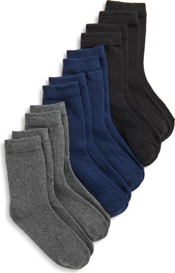 Soft, breathable cotton enhances the comfort of kid-size dress socks packaged in an assortment of dark colors that pair easily with any favorite look.