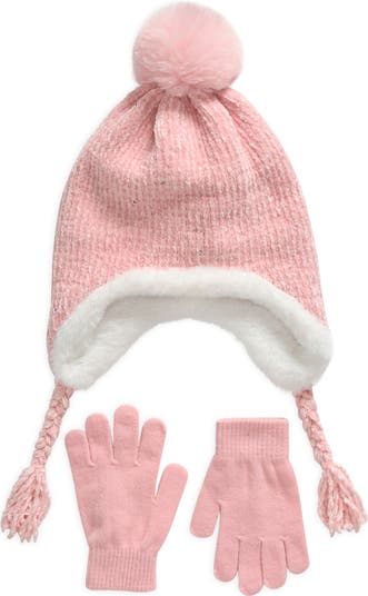 A cute earflap cap with a fluffy faux-fur lining brightens dreary days with a colorful design featuring a fluffy pompom and braided chinstraps. Soft gloves complete the cozy, kid-approved look.