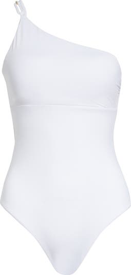 This sleek one-shoulder swimsuit makes for a chic poolside look, with golden hardware accenting the straps.
