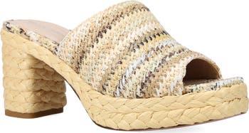 A raffia-wrapped platform and block heel add espadrille-inspired styling to a lofty slide sandal featuring a padded footbed for daylong comfort.