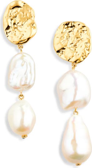 A hammered finish gives organic-inspired texture to these drop earrings that are strung with baroque freshwater pearls.