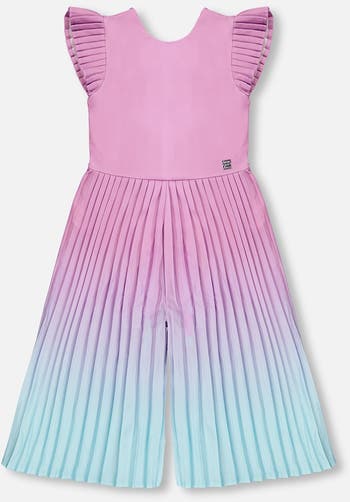This capri jumpsuit in mauve gradient is a playful piece for special occasions. The sleeveless jumpsuit features a smooth bodice with pleated flutter sleeves and wide capri legs in a striking pleated gradient that fades from mauve to light blue. Made from soft polyester with a hint of stretch, it offers both comfort and elegance for young girls.