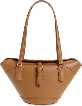 A fold-over top secured with a magnetic buckle strap secures your essentials within this leather tote designed in a basket-inspired triangular silhouette.