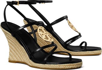 A gleaming logo medallion stands out front and center on this lofty espadrille wedge topped with slim straps.