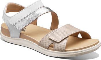 A trio of adjustable straps deliver a customized feel on a leather sandal grounded by a foam-cushioned footbed and shock-absorbing sole.