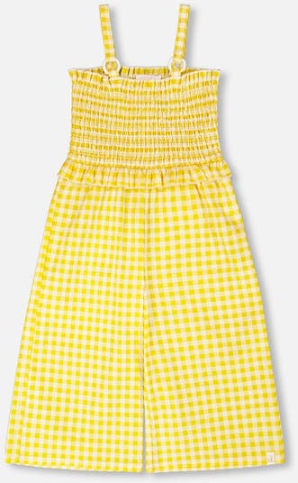 This capri jumpsuit with smocking in yellow gingham is full of charm and playful ease. This fun one-piece features adjustable straps, wide legs with capri length, and a smocked bodice for comfort and a sweet fit. Perfect for sunny days, this lightweight piece invites carefree adventures under the summer sky.