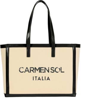 Our Carmen Sol branded tote is handmade in Italy, crafted from colorful vegan leather trim and canvas