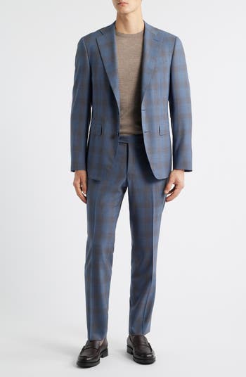 Premium Italian wool in a plaid of dusky blues and earthy browns relaxes the formality of a suit that's tailored in a trim fit and fitted in the waist for a refined, formal look. The flat-front trousers sit above the hips and complement the traditional detailing to keep the silhouette crisp and smart.