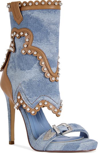 Polished studs accentuate the Western details of this bold ankle-cuff sandal set on a lofty stiletto heel.