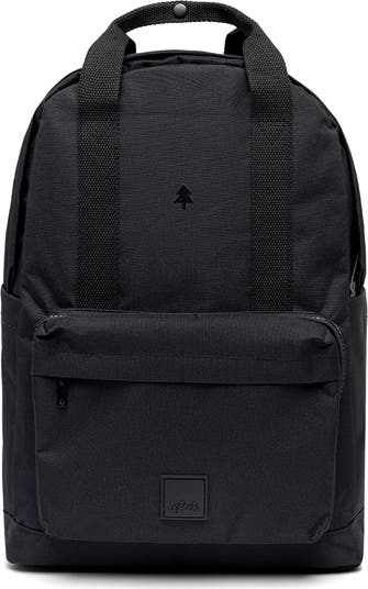 Classic silhouette with characteristic cotton handles. In addition to being comfortable to carry, it provides extra security thanks to the button closure added to its top handles. The large interior compartment features a padded 14" laptop sleeve, multiple organisers for small items and a special bottle pocket. Double quick-access zipped front pocket and side pockets with snap closure. Back security zipped pocket and back band to attach the backpack to a trolley handle. Padded and adjustable handles.