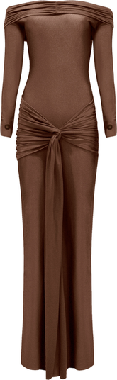 Maxi fitted dress made of Lycra fabric with iridescent shimmer/sparkle. Its strapless-style draped neckline, long sleeves with a thumbhole opening, and adjustable draping at the hip enhance the figure with elegance and sophistication.