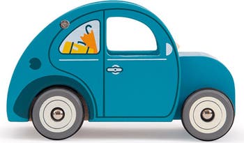 Made of screen-printed wood, it has a boot that opens for storing his suitcase.
