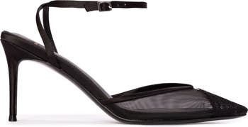 Pointy toe mesh ankle strap pump with lace detail on the toe, set on a stiletto pin heel. Made with satin crepe.