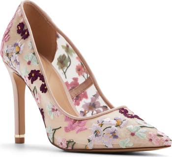 Elegant floral embroidery accents the mesh upper of a whimsical pointy-toe pump lofted by a soaring heel with a signature metallic inset.