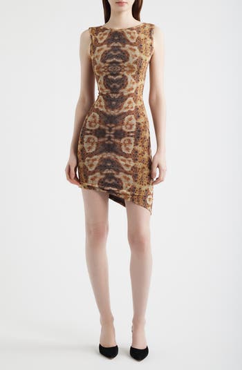Make a modern statement in this asymmetric body-con minidress splashed in a dynamic abstract print. A sleek jewel neckline and sleeveless silhouette balance the low back and angled hemline for a look that's equal parts alluring and unforgettable.