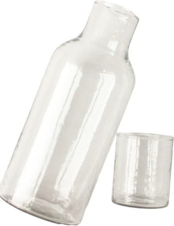 Form meets function in these stunning glass carafes. Each is handblown from recycled glass then meticulously hammered by hand for a truly unique finish. The set includes a carafe and lid that doubles as a small drinking glass.
