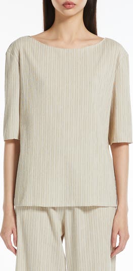 Solid-shaded tops are wardrobe workhorses, which is why it's smart style to have options that add something, like a crinkled texture and elbow-length sleeves, to the staple look.