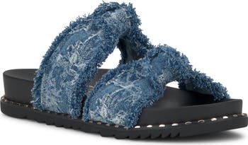 Frayed edged and a studded welt add an edge to this slide sandal that offers support on a contoured footbed.