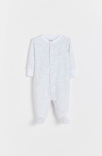 Printed Pima cotton footie with a leg and long sleeves, and snaps across the front from the neck to the feet. Made of soft Pima cotton.