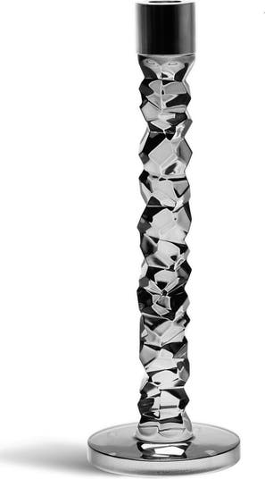 Crafted with irregular cuts of crystal that reflect the light beautifully, this stainless steel–detailed candleholder makes an elegant addition to any décor.