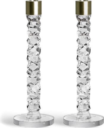 Crafted with irregular cuts of crystal that reflect the light beautifully, these brass-detailed candleholders make an elegant addition to any décor.